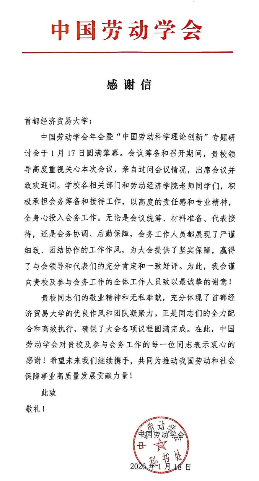 近日,中国劳动学会向制服做爱 发来感谢信,向学校各相关部门和制服做爱 筹备召开中国劳动学会年会暨“中国劳动科学理论创新”专题研讨会的全体工作人员致以最诚挚的谢意。